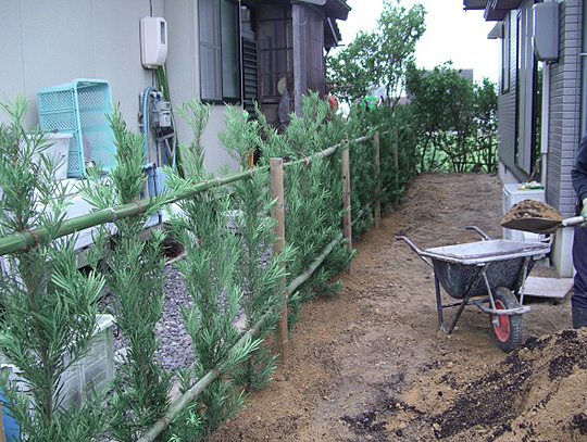 | 施工のポイント | 玄関前と敷地横の外構・植栽をお任せいただきました。 この度は、既植してある樹木の撤去・生垣・かご植栽・砕石敷きetcを施工。 奥様は、[花と緑のフェアー]にもご来場くださり、追加で樹木やかごをご購入いただきました。 かご植栽にビバーナムダビディーティヌス・前側の生垣にはレッドロビンを、そして横側の生垣にはラカンマキを植栽しました。 かご植栽は、土留めの役割も果たしています。 施工前も自然な感じで個人的には好きでしたが、かご植栽で、またひと味違った雰囲気の空間に仕上がったのではないでしょうか。 施主様は、気前が良く、いつでも誰に対してもお心配りをしてくださる、とても笑顔の素敵なご夫妻でした。 春には、そんな笑顔プラス、かごの植栽に手が加えられ、また少し雰囲気を変えたお庭になる事でしょう♪ |